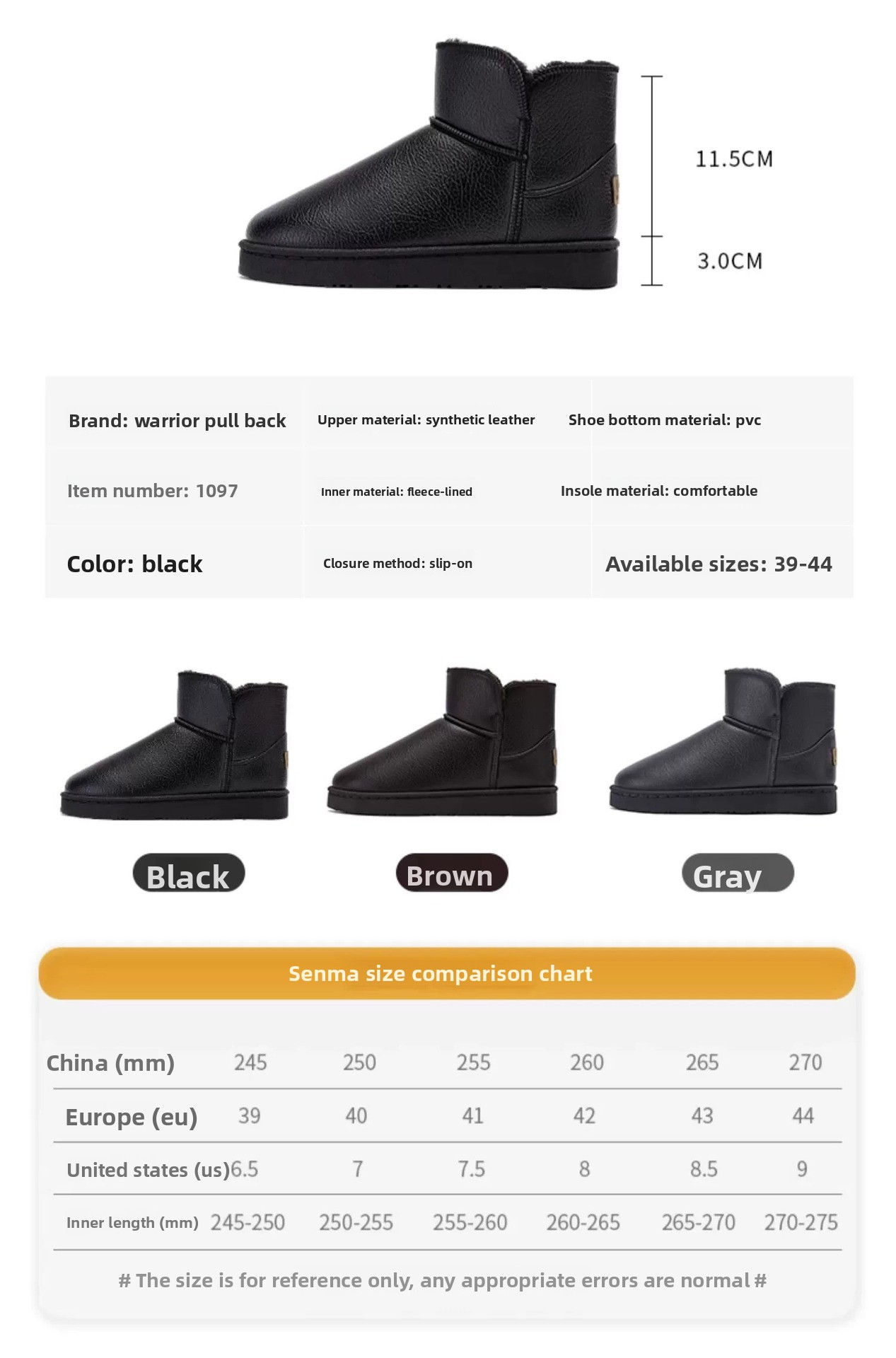 Colors available: Black, Gray, Brown