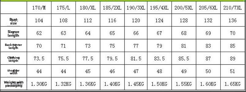 Sizes: M-170, L-175, XL-180, XXL-185, XXXL-190, 4XL-195, 5XL-200, 6XL-205, 7XL-210.